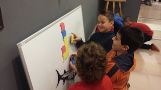 Hem anat al Museu de la matemàtica i ens ho hem passat molt bé. Vam experimentar amb els cossos geomètrics: vam fer un cub i un pou, vam fer tangrams, vam escriure el nostre nom fent servir l'eix de simetria, vam fer construccions..., i fins i tot, una cúpula amb tota la classe. Va ser molt divertit!